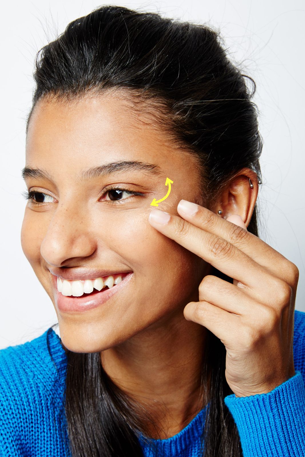 Your ring finger, which is your weakest, will apply just the right amount of pressure to blend in the concealer without pulling at your delicate eye skin, and the orange or peach tones will cancel out the blue shadows that your under-eye circles give off.