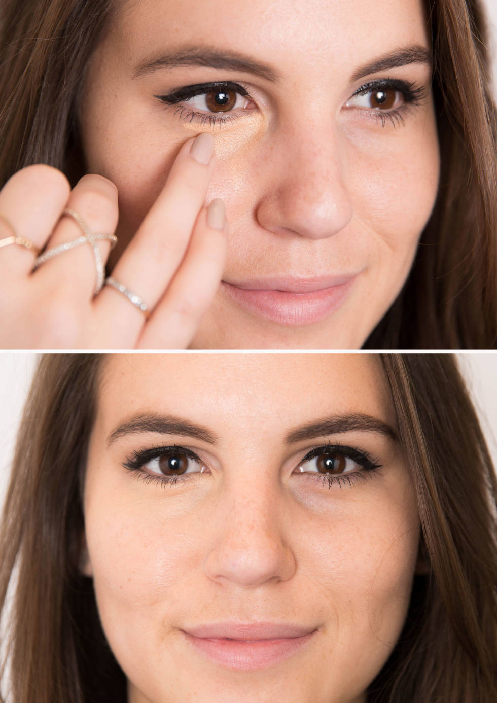 Next, apply your concealer. “It should create a halo effect around your eyes” – Turnbow. Use your fingers to pat it on along the tops of your cheekbones. Then, bring it up until it reaches just above the tip of your eyebrows. “Look for a concealer with a radiant aspect to it. This will help attract the light.”