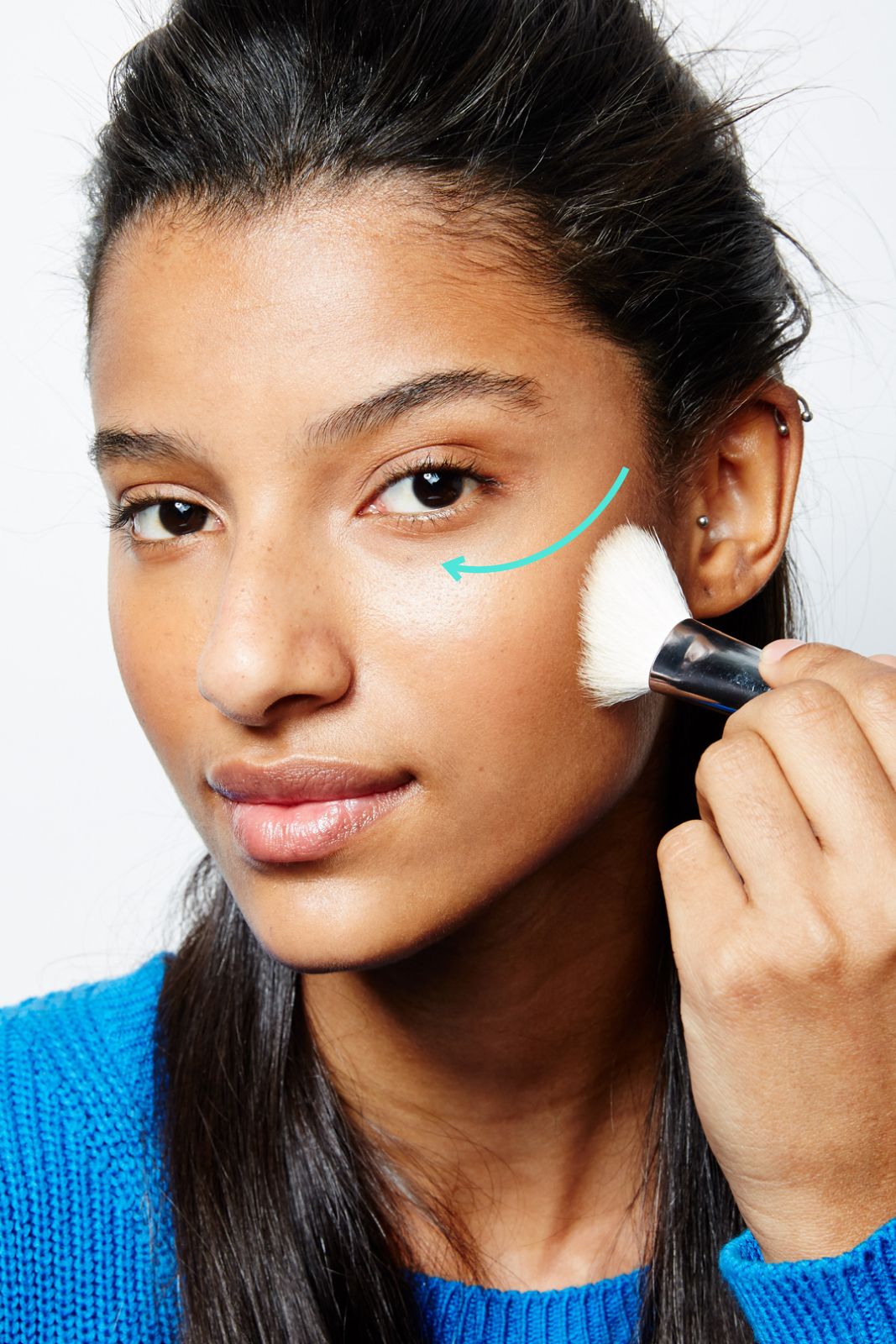 Start with your contour powder. Find your cheekbones, and slide the pigment just below them in a downward motion. “It should end a couple of inches away from the corner of your mouth.” Use about two shades lighter than your skin tone,” – Tina Turnbow @Refinery29