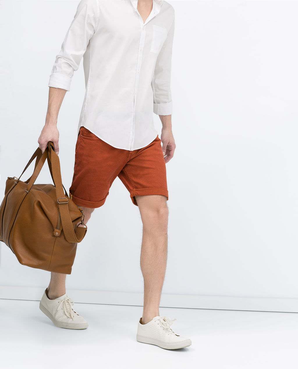 If shorts are permitted at work, but a certain dress code is still required then a button down shirt is the answer. Plain, white and fitted, with rolled-up sleeves.
