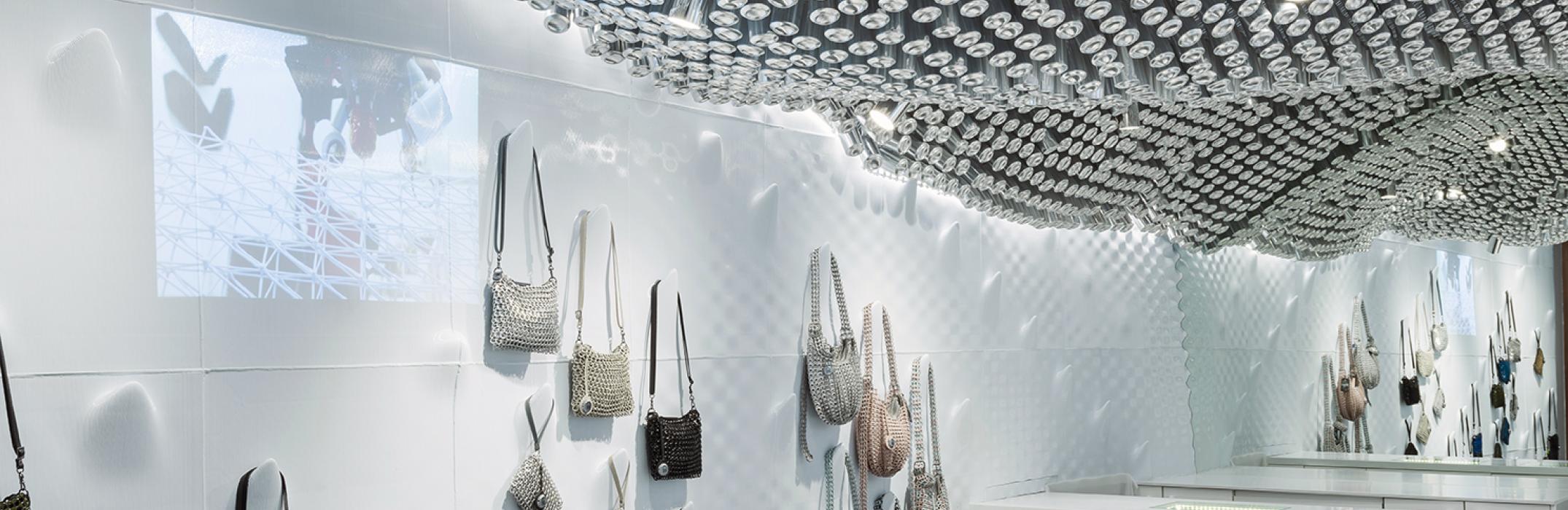 We launched our flagship retail store on Regent street at #84 last year. We wanted to make a statement on how technology can also play a critical role in sustainability and fashion conversations around architecture and design. It’s the world’s first 3D printed store using plastic bottles. Plastic has been collected from the communities in East Africa and India then cleaned, crushed and turned into huge panels that make up the walls of the store. The latter structure sits behind an extraordinary sculpture on the ceiling. It’s a metal canopy made out of thousands of reject manufactured cans. It’s the play on concept of effectively creating fabric out of the remaining part of the can. We use the metal ring pulls as a signature material in our designs. Then we created a fabric from the remains part of the can to create the sculpture covering the ceiling. We did that on a 3D printed waste plastic.